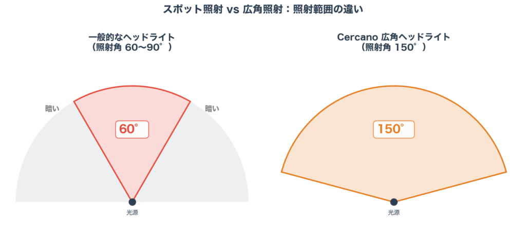 照射角度の比較図でも示しているとおり、広角と遠距離照射では光の広がり方がまったく異なります。Cercano広角ヘッドライトが採用した広角ライト+望遠ライトの2灯構成(370lm/照射距離150m)は、この問題への直接的な回答です。